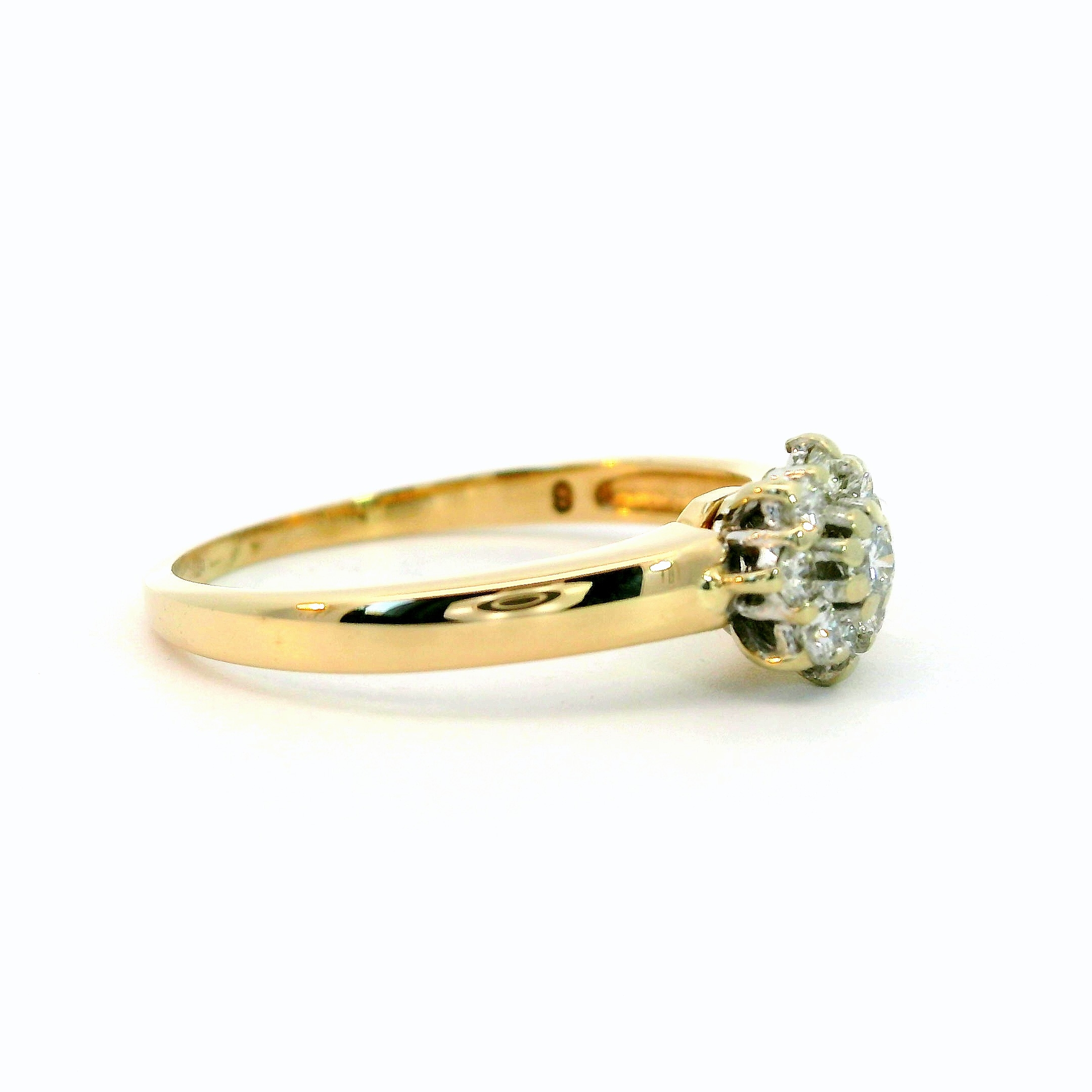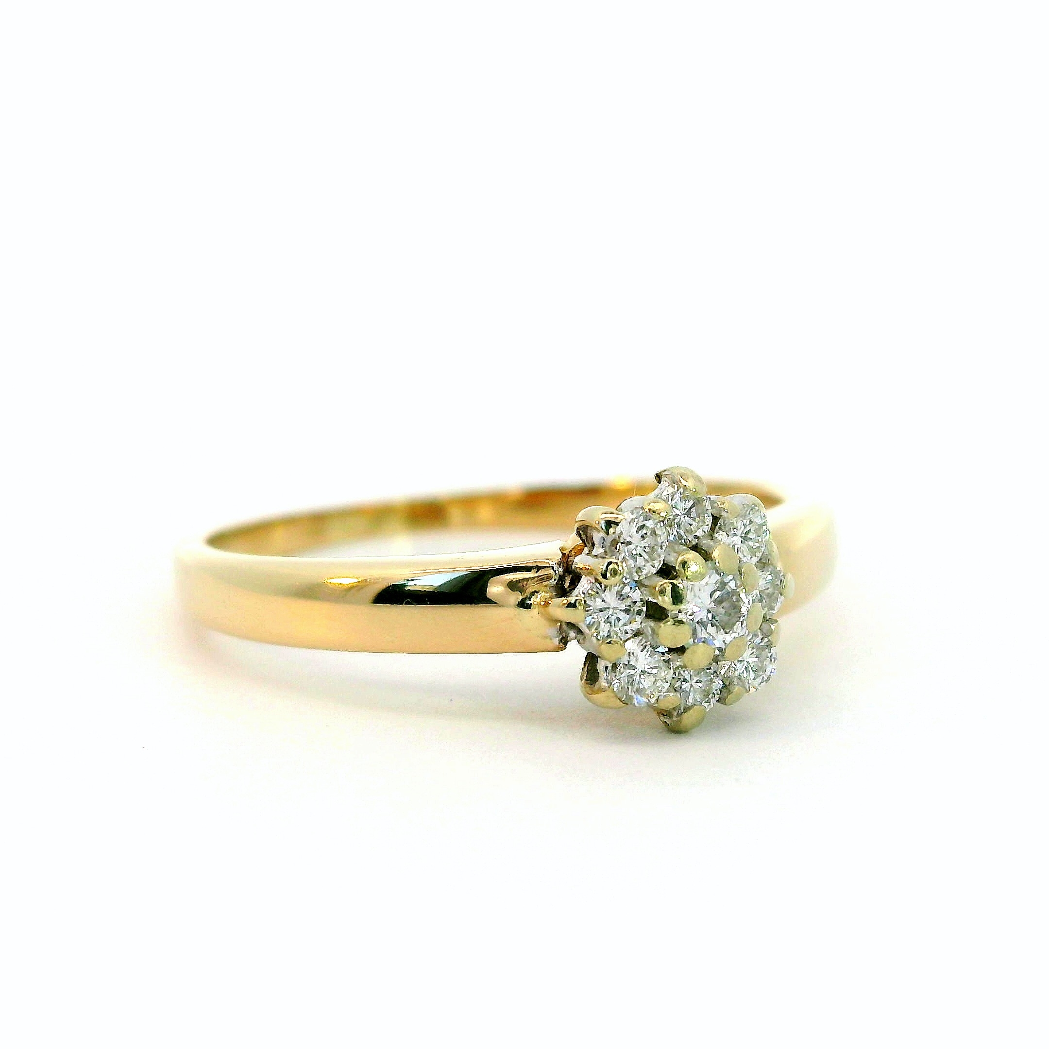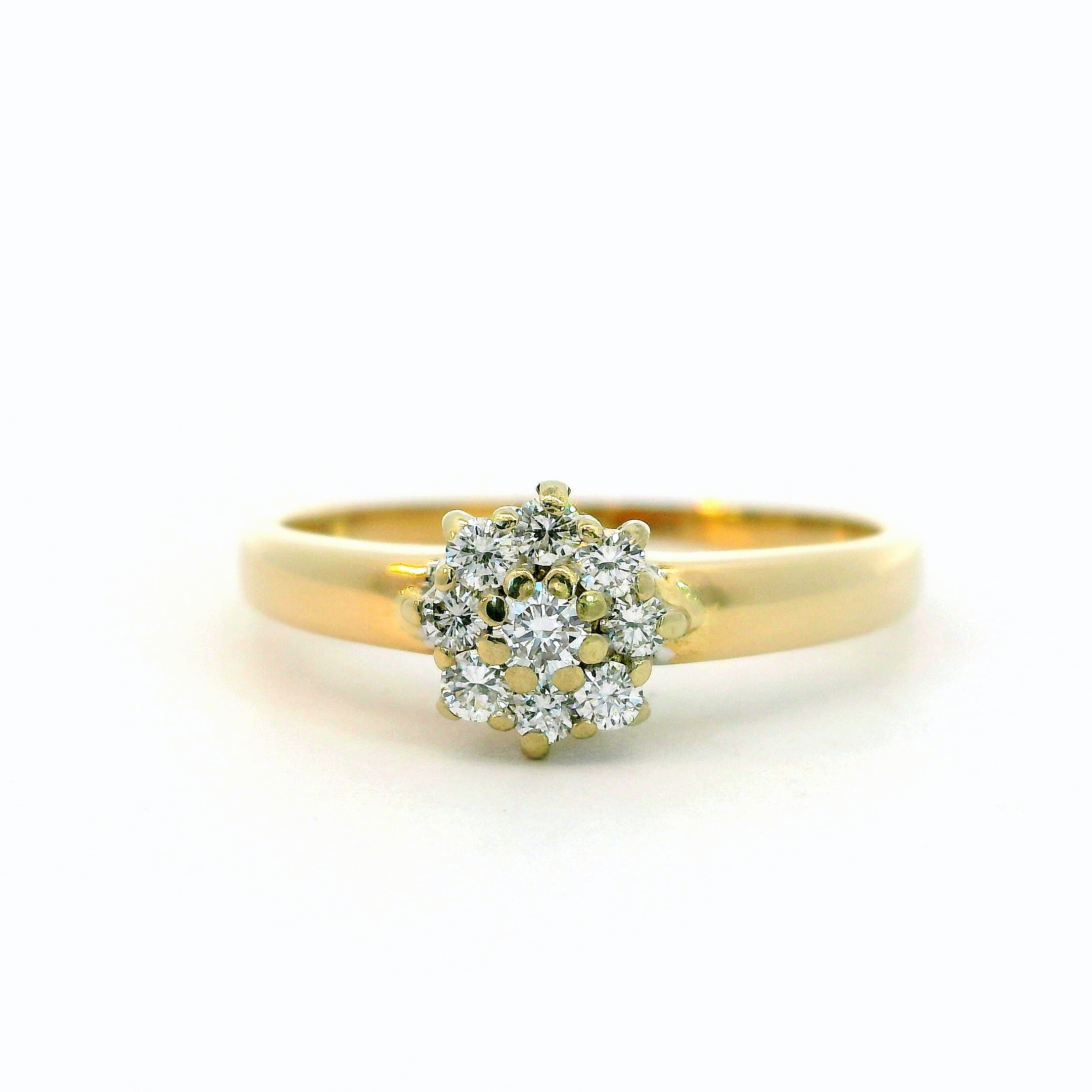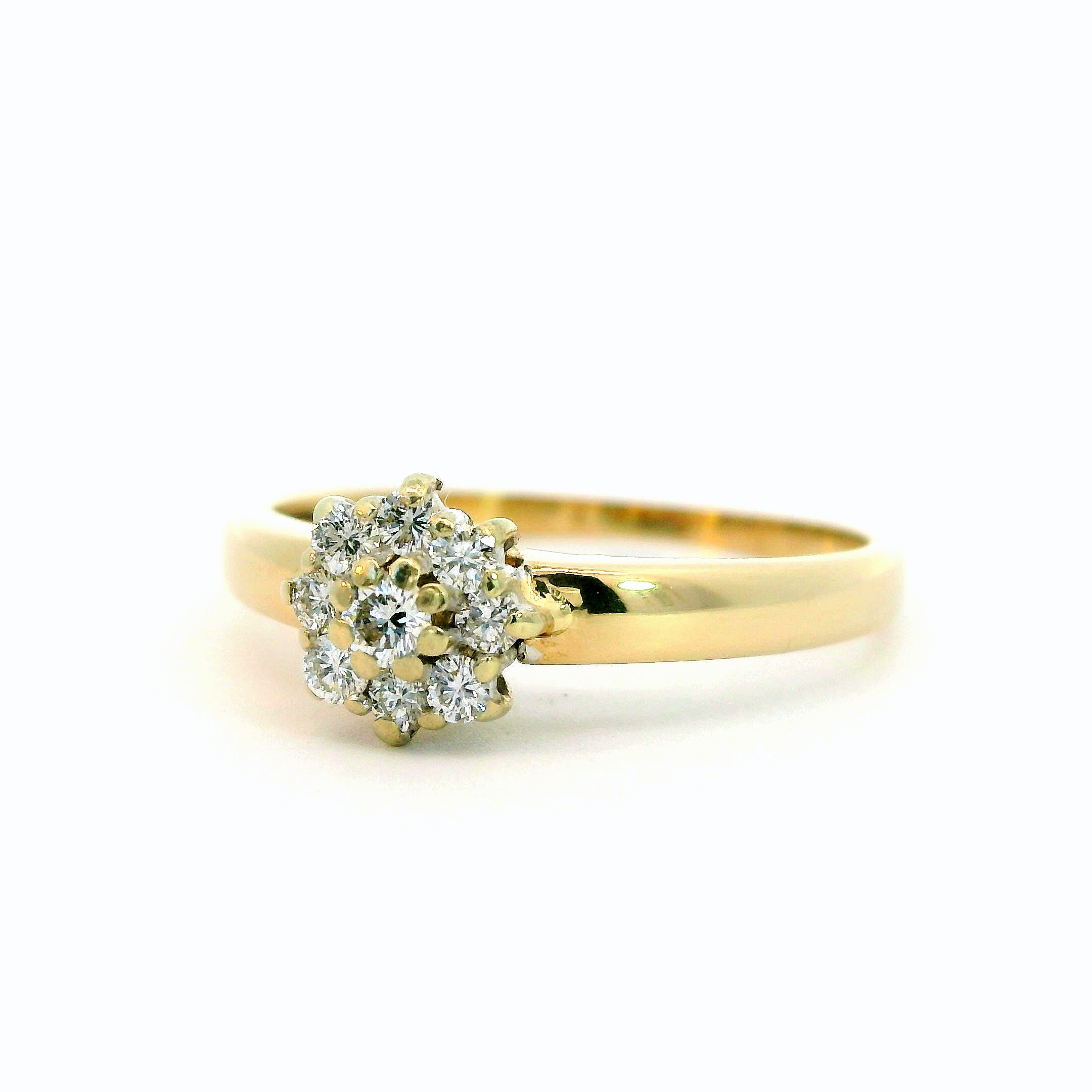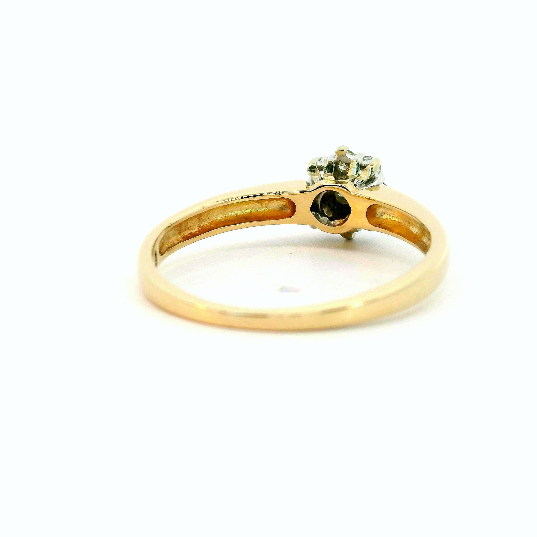 Schöner filigraner Damenring mit 9 Brillanten in Blütenform gefasst, 14 Karat Gelb- & Weißgold. Die Brillanten haben zusammen ein Gewicht von ca. 0,10 ct und die Qualität Wesselton-SI. Ringgrösse 52. Gewicht etwa 1,99 g.